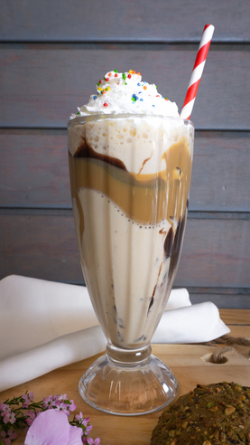 Milkshake cremoso que combina un helado cremoso de lúcuma con manjar o lúcuma con chocolate coronado con crema batida y salsa de chocolate o manjar a tu elección es pura dulzura en cada sorbo.