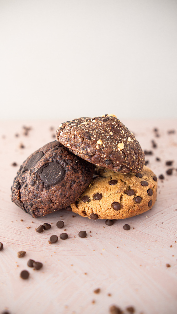 Galleta de chocolate con trozos de avellana y nueces, y un cremoso corazón de ganache de avellana. Pura entrega en cada bocado